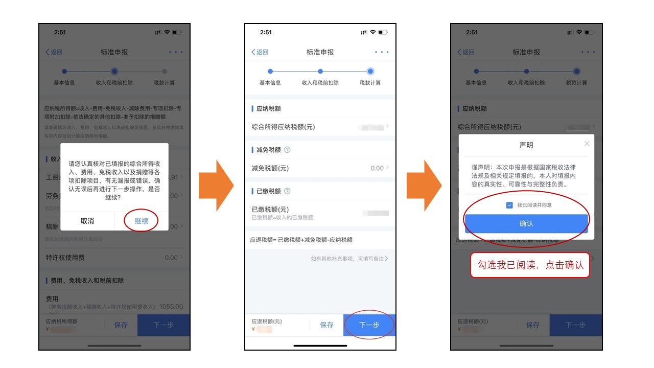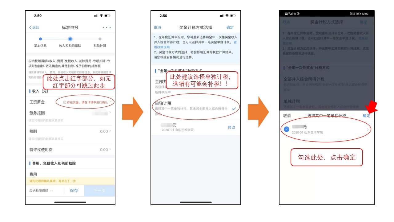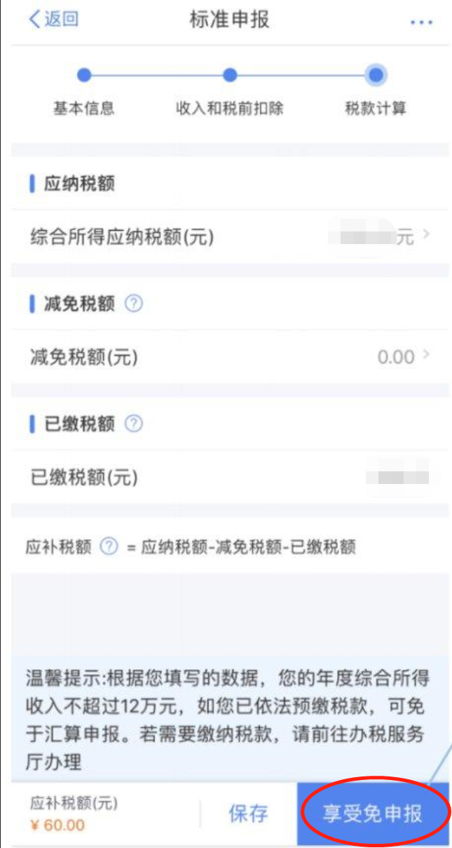 如下图,400元以内可以享受免申报。400元以上按提示绑定银行卡补税。