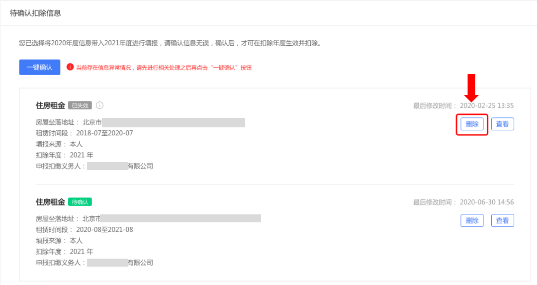 注意:如有“已失效”状态的信息,则需先删除之后才能点击“一键确认”。