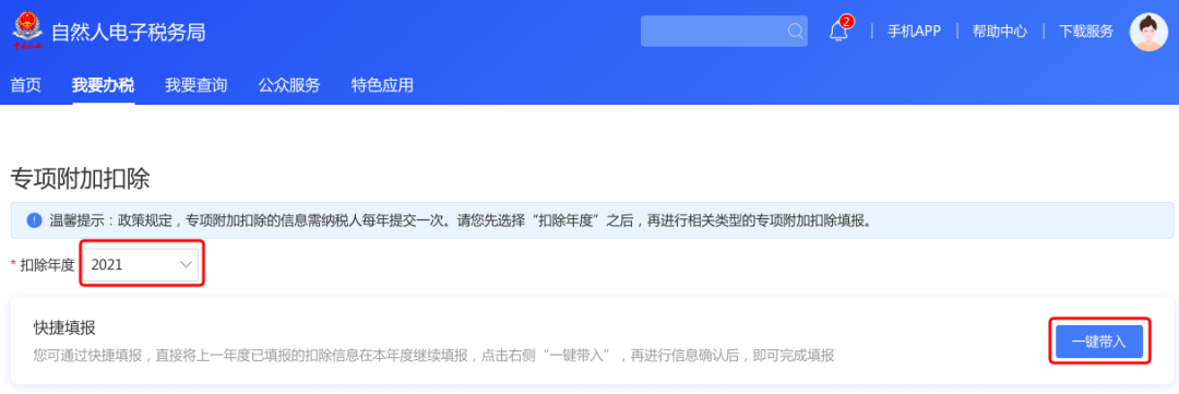 ① 打开个人所得税APP-首页-“专项附加扣除填报”-选择“扣除年度”——“一键带入”;如下图1、图2: